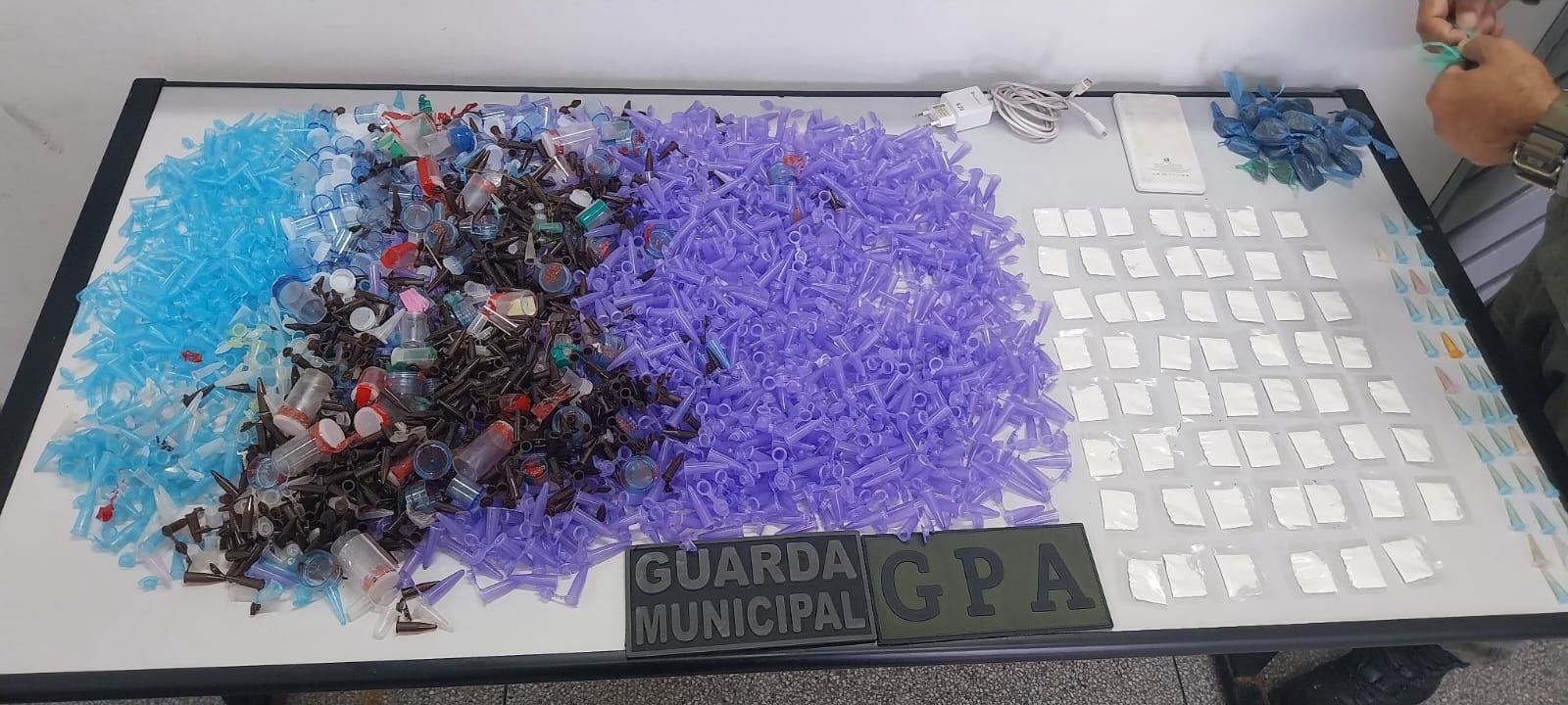 Depois, a equipe do Grupamento de Proteção Ambiental (GPA) recebeu denúncia de tráfico no Jardim Europa. Ao chegar, os guardas viram um suspeito tentando fugir. Durante buscas, encontraram sacolas com 55 porções de cocaína, 35 de crack e 32 de maconha, além de pinos plásticos para acondicionar drogas. Todo o material foi levado ao 1º Distrito Policial do Boa Vista.