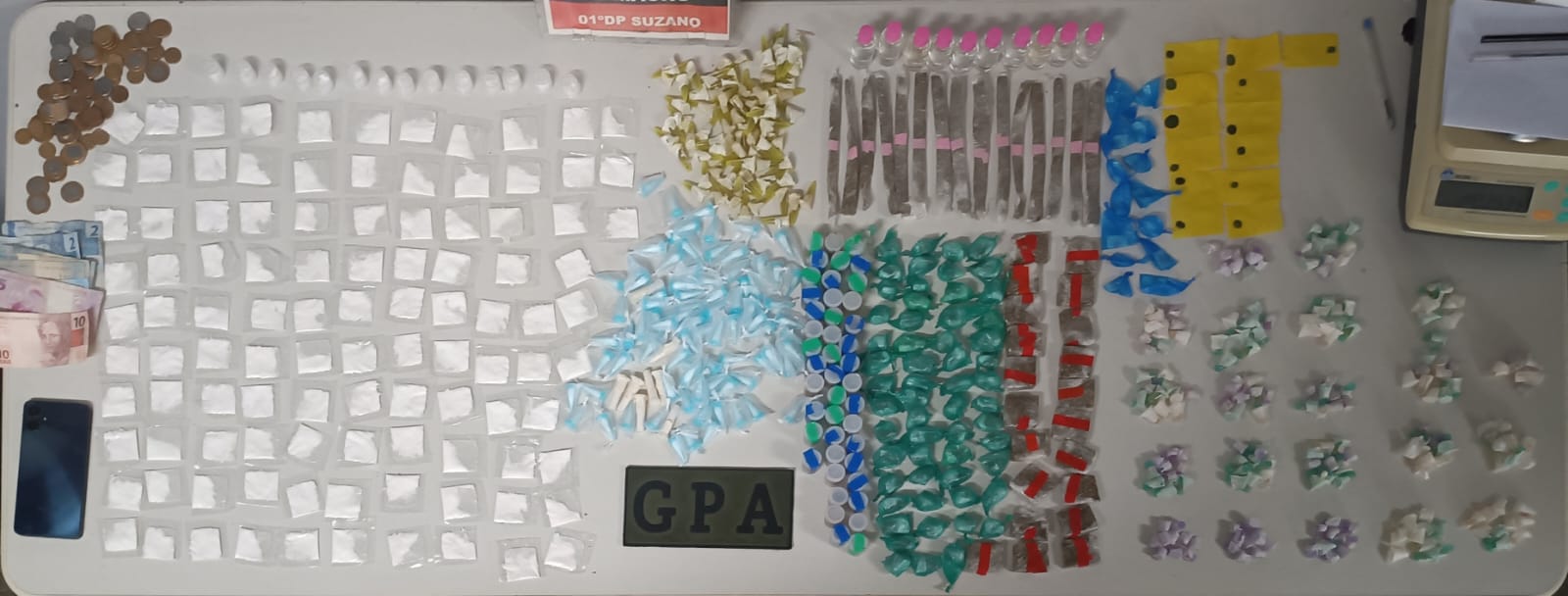 Além disso, os guardas localizaram uma sacola preta abandonada nas proximidades. Dentro dela havia 188 porções de cocaína, 128 de crack, 40 de maconha e 25 de K9 (droga sintética semelhante à maconha), totalizando 381 porções.
