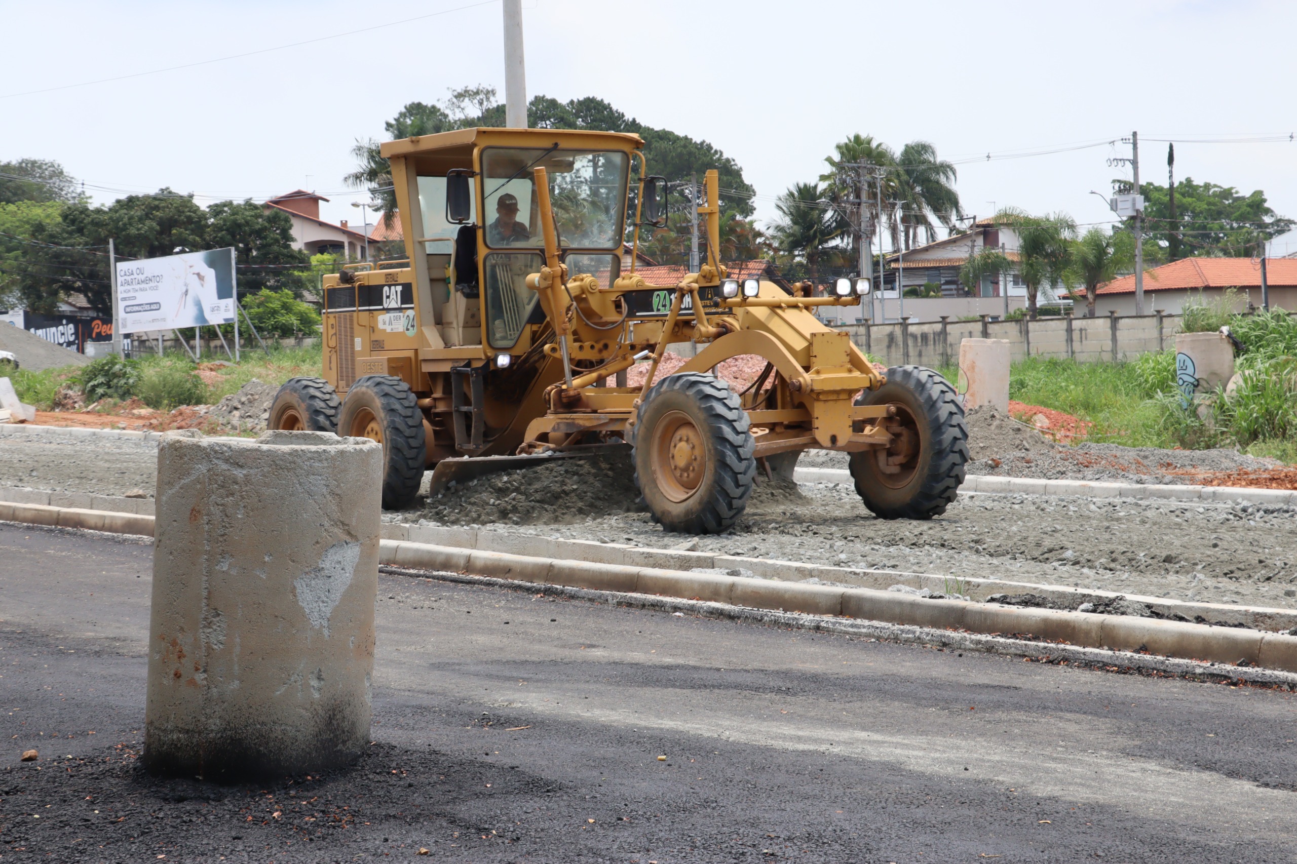 - Rotatória com as estradas Santa Mônica e dos Fernandes: as equipes realizam o acabamento da base com aplicação de BGS (brita graduada simples), garantindo resistência ao pavimento.