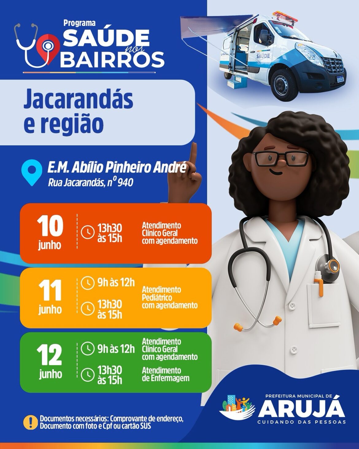 Lembre-se: Para ser atendido, é necessário apresentar comprovante de endereço, Cartão SUS, documento com foto e CPF. Aproveite a oportunidade e cuide da sua saúde!